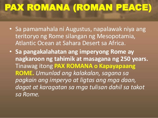 Ang panahon ng Pax Romana ay hindi lang kilala bilang panahon ng kapayapaan ito din ay mahalagang yugto para sa mga mamamayandahil sa mataag na. Ang panahon ng Pax Romana ay hindi lang kilala bilang panahon ng kapayapaan ito din aymahalagang yugto para sa mga mamamayan dahilsa mataag na. 31102016 Hinangad ng mga mamamayan ang isang lider na tulad ni Julius Caesar at Augustus Caesar na magaling mamuno at may kakayahang pag-isahin muli ang Roma.